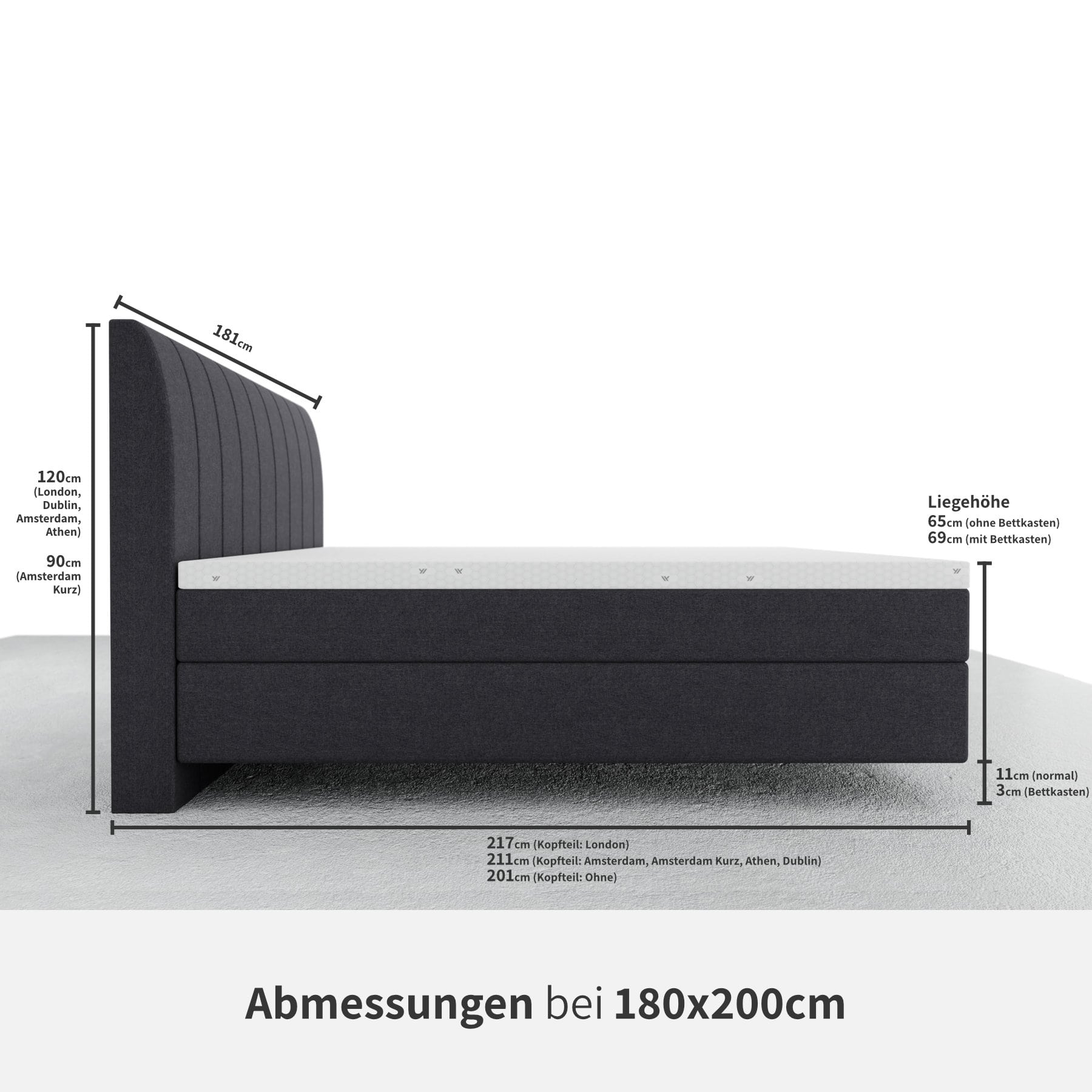 Länge, Höhe und Liegehöhe des Boxspringbetts bleiben bei allen Bettgrößen gleich.