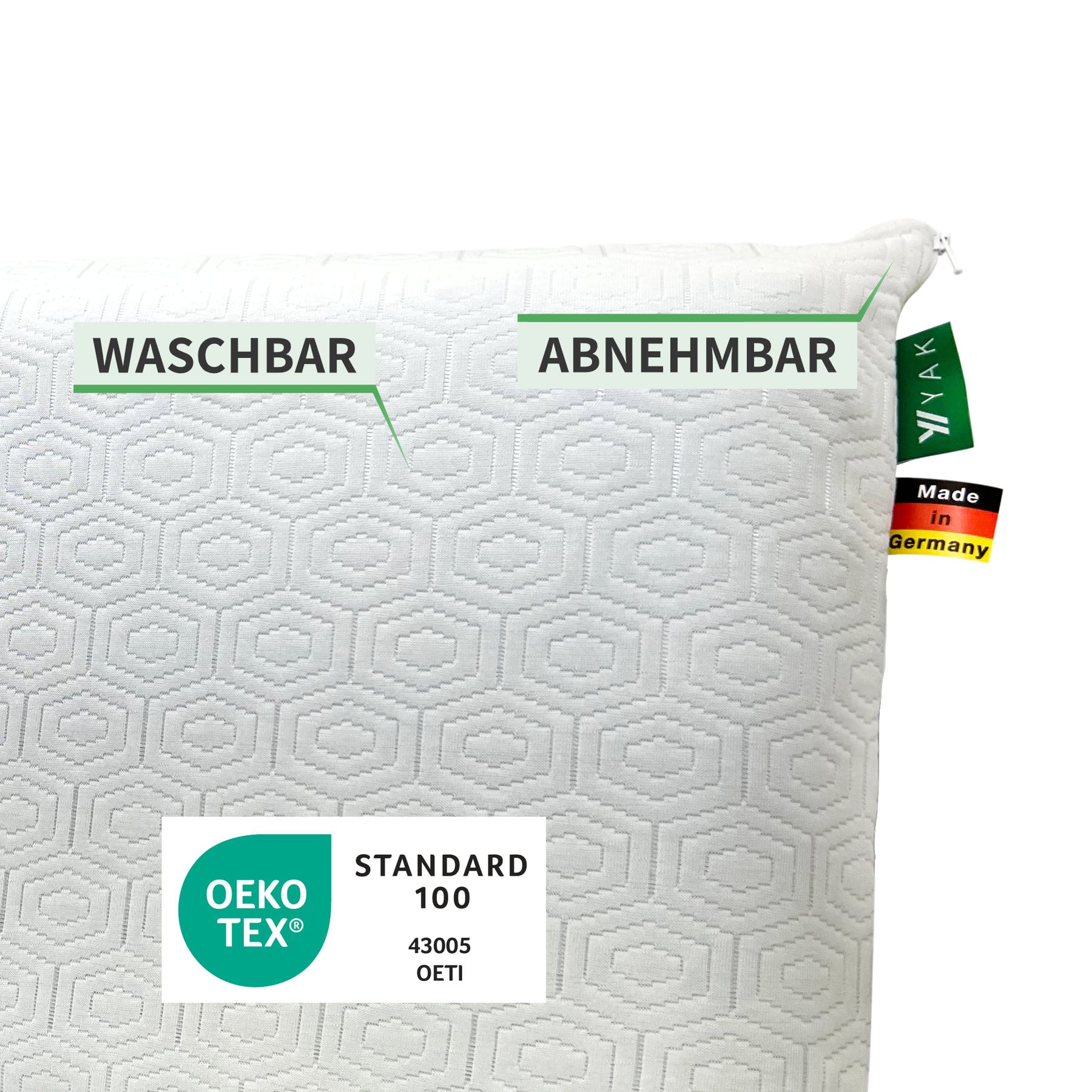 Das orthopädische Nackenkissen von YAK besteht aus Viscoschaum und Gelschaum, die individuellen Komfort versprechen. Der Viscoschaum ist für ruhige Schläfer geeignet und bietet eine optimale Anpassung. Der Gelschaum sorgt für ein Liegegefühl wie auf Wolken.