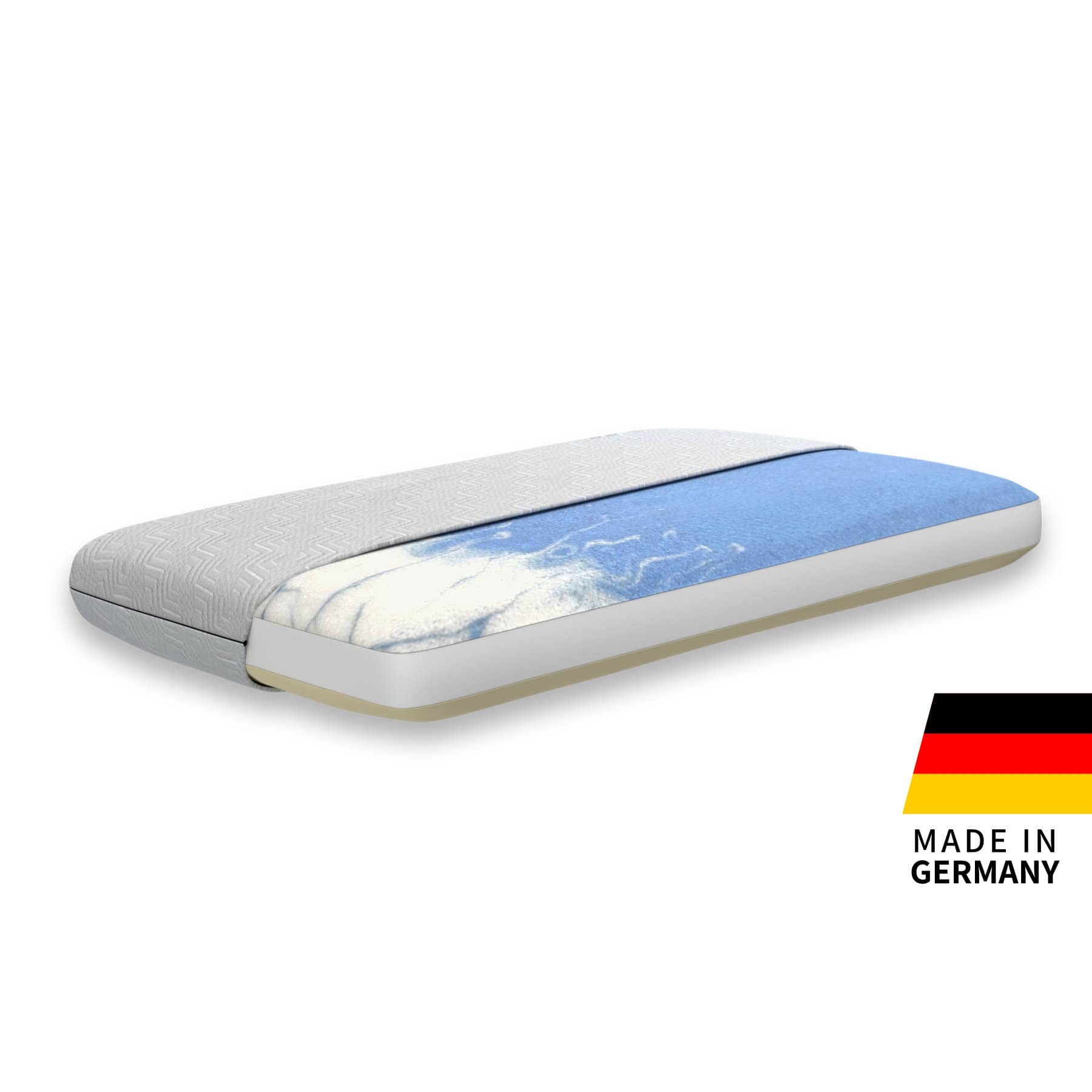 - Gelschaum (Blau/Weiß) ist für ruhige und unruhige Schläfer geeignet und ist kühlend. Der Schaum erzeugt das Gefühl, wie auf einer Wolke zu schlafen.