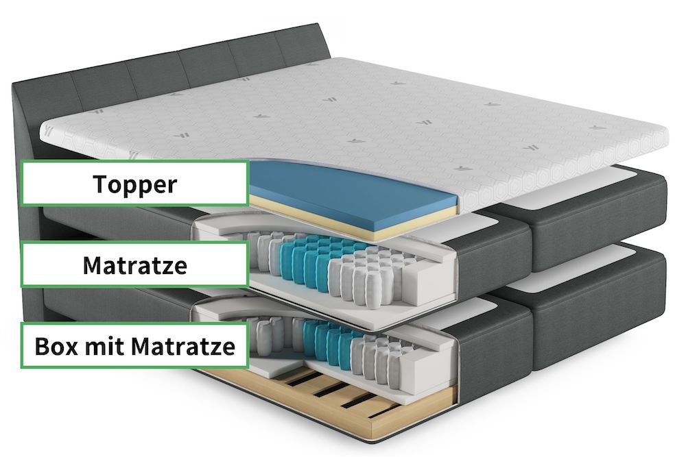 Der Topper liegt auf der Matratze fürs Boxspringbett. Zum einen soll er die Matratze im Boxspringbett vor Feuchtigkeit, Verschmutzung oder Abnutzung schützen und zum anderen erhöht er den Liege- und Schlafkomfort in jeder Schlafposition deutlich. Somit ist der Topper die ideale Ergänzung Deines Boxspringbettes, denn er verbessert die Liegeeigenschaften.